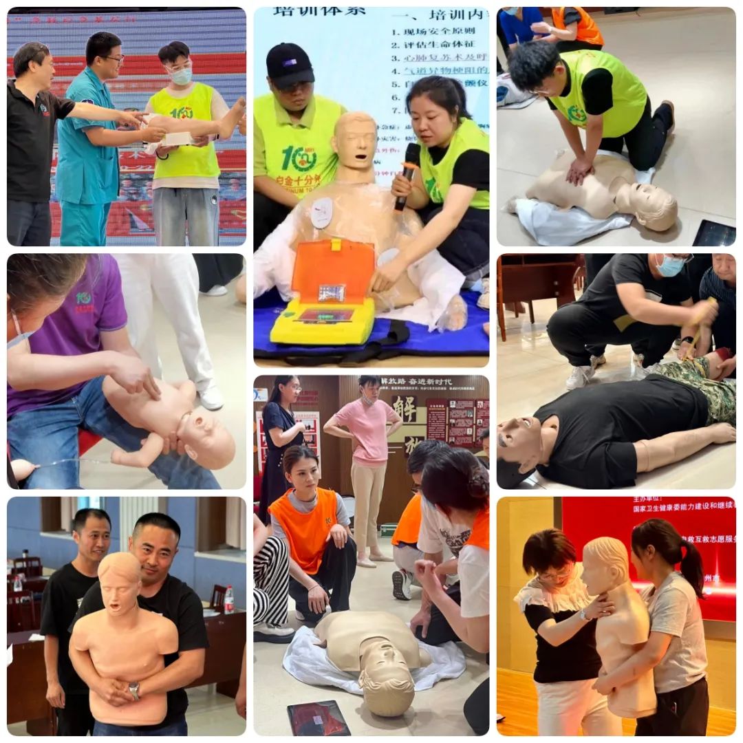 天津天堰科技股份有限公司作为本次活动的公益支持单位,全程参与并提供培训产品支持。在现场实操环节,“白金十分钟 黄金一小时”专家团队及各院专家团队共同为参会人员科普宣讲急救知识,培训急救技能。针对心肺复苏操作、解除气道异物操作、AED操作等实用技术进行分组轮训,为大家演示和讲解急救操作技能,详细分解示范演练规范动作,手把手教授动作要领,带领大家积极参与,动手练习。